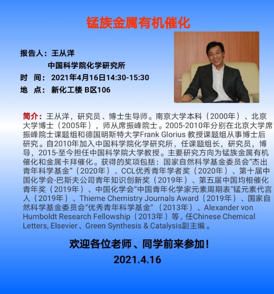 學術地點 新化工樓B區106 主講人 王從洋 中國科學院化學研究所