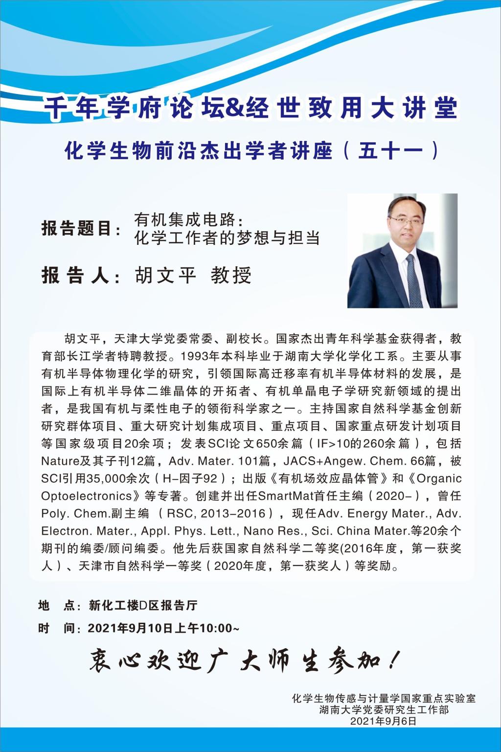 學術地點 新化工樓D區報告廳 主講人 胡文平 教授