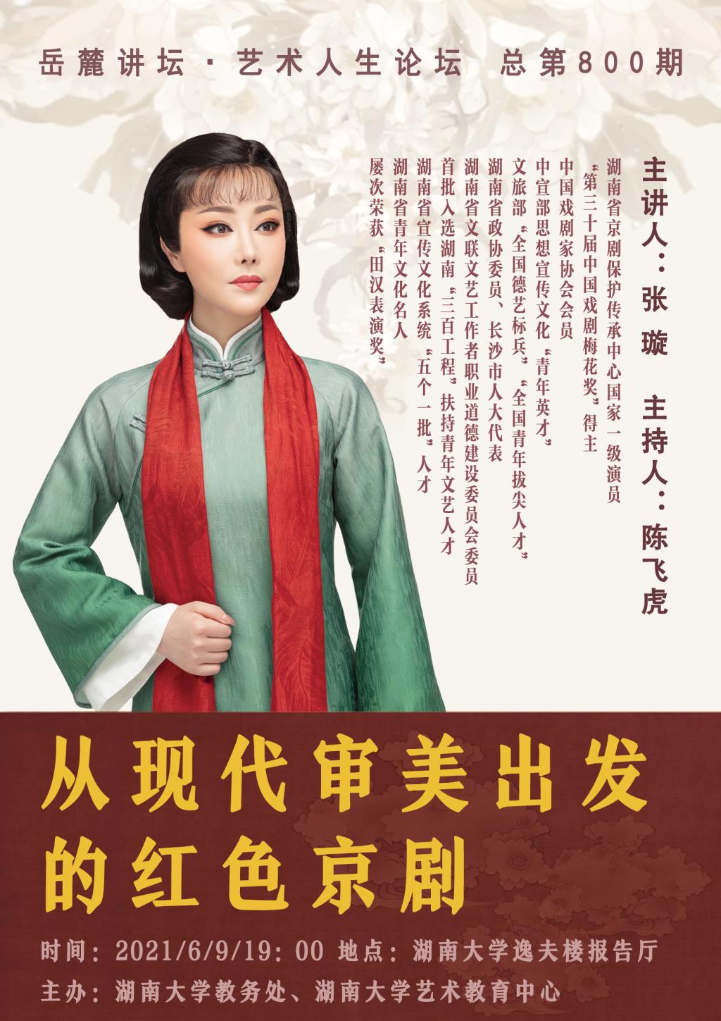 主講人:張璇(湖南省京劇保護傳承中心國家一級演員,“第三十屆中國戲劇梅花獎”得主,中國戲劇家協會會員,中宣部思想宣傳文化“青年英才”,文旅部“全國德藝標兵”、湖南省政協委員,長沙市人大代表,湖南省文聯文藝工作者職業道德建設委員會委員,首批入選湖南“三百工程”扶持青年文藝人才,湖南省宣傳文化系統“五個一批”人才,湖南省青年文化名人,屢次榮獲“田漢表演獎”)
