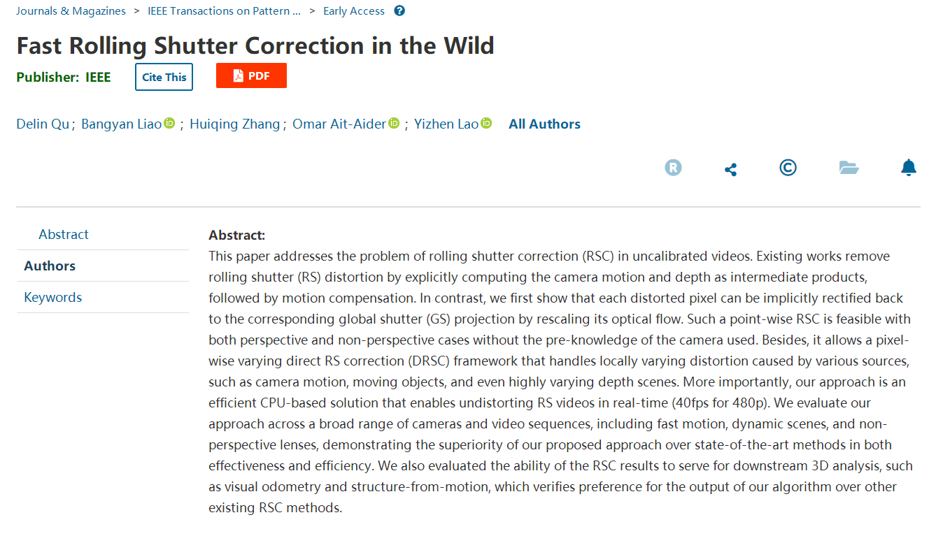 2023/06/21勞奕臻副教授指導(dǎo)兩名本科生在卷簾快門相機(jī)的三維視覺應(yīng)用研究取得進(jìn)展近日,信息科學(xué)與工程學(xué)院勞奕臻副教授指導(dǎo)兩名本科生在卷簾快門相機(jī)(Rolling shutter)的三維視覺應(yīng)用領(lǐng)域取得進(jìn)展,針對(duì)卷簾快門相機(jī)因時(shí)空離散的曝光模式易導(dǎo)致圖像出現(xiàn)幾何形變的問題,提出了一種高效的圖像...